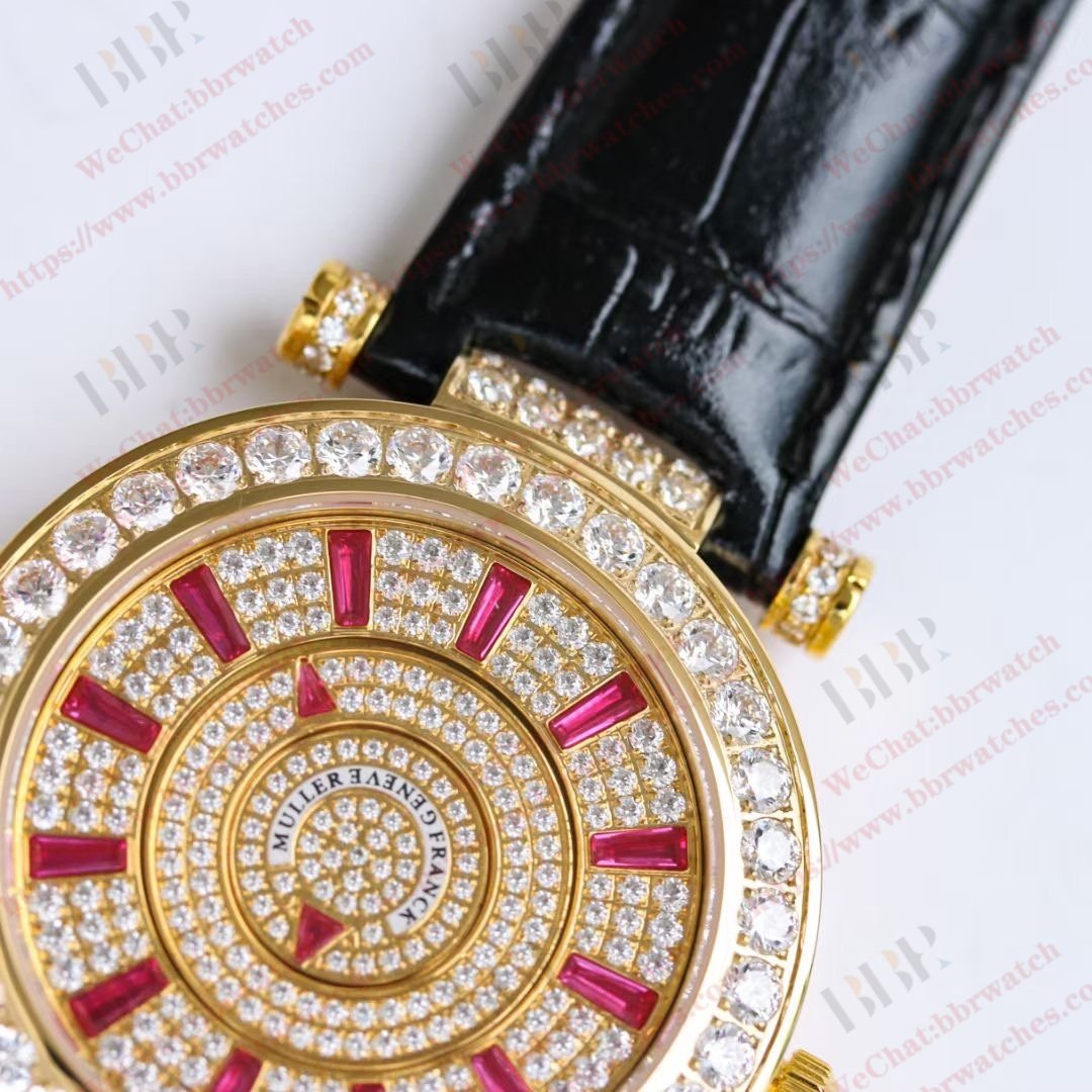 【表壳】表壳、表盘和表耳均镶嵌共 598 颗顶级施华洛世奇水晶。为达到原本闪耀整洁的外观,每颗宝石都由珠宝镶嵌师精心挑选,确保大小、火种和镶嵌的统一。[口径]采用 9015 改装 FM.800 型机芯。尺寸表扣板根据原厂水洗图案克隆,图案干净利落,呈现出美观大方的外观。[表带]采用意大利小牛皮,表带颜色与正品完美搭配。表耳的表扣和螺丝可与原装互换使用。
